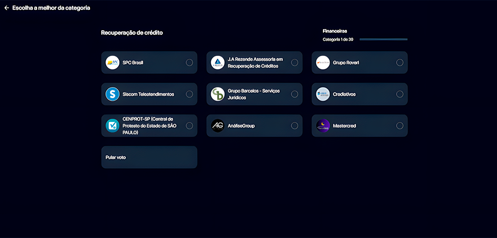 Você será direcionado para a área de votação, basta selecionar a categoria “Financeiras”, a subcategoria “Recuperação de Crédito” e votar na Crediativos.