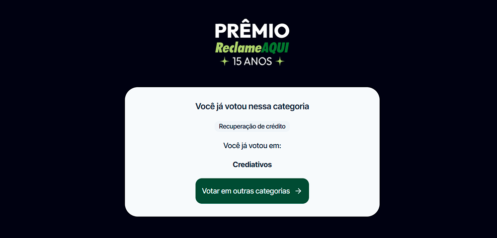 Pronto! O seu voto foi registrado. Com a sua ajuda, estamos mais perto de conquistar o Prêmio Reclame Aqui 2025.